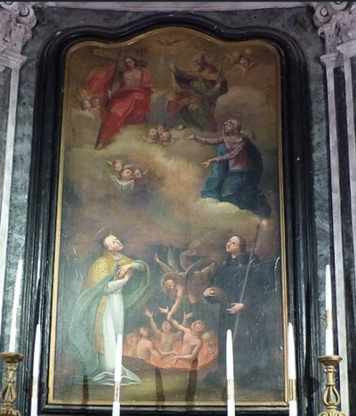 Le tableau de la chapelle latérale dite des Ames du Purgatoire de La Turbie semble confirmer notre propos. Sous la représentation du Couronnement avec un Christ tenant une immense Croix, on voit sur la droite la Vierge Marie implorante et, au bas du tableau, une représentation des âmes du purgatoire grouillant dans une fournaise avec au-dessus l’Archange Saint Michel, à gauche saint Odilon de Cluny (2) et un pèlerin anonyme intercédant pour les âmes du purgatoire.