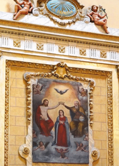 La grande peinture religieuse n’a eu de cesse de représenter Marie dans toutes les étapes de sa vie. A sa mort, entourée des disciples du Christ, accueillie au ciel corps et âme par le Christ. Si la Renaissance, et les dévotions nées après la Contre-réforme catholique, se sont attachées à représenter son Assomption glorieuse, le « Couronnement de la Vierge » est quant à lui un épisode apocryphe qui se place précisément après l’Assomption. La Vierge est représentée entourée par le Père et le Fils la couronnant, la colombe qui domine la scène représente symboliquement le Saint Esprit comme chacun sait.