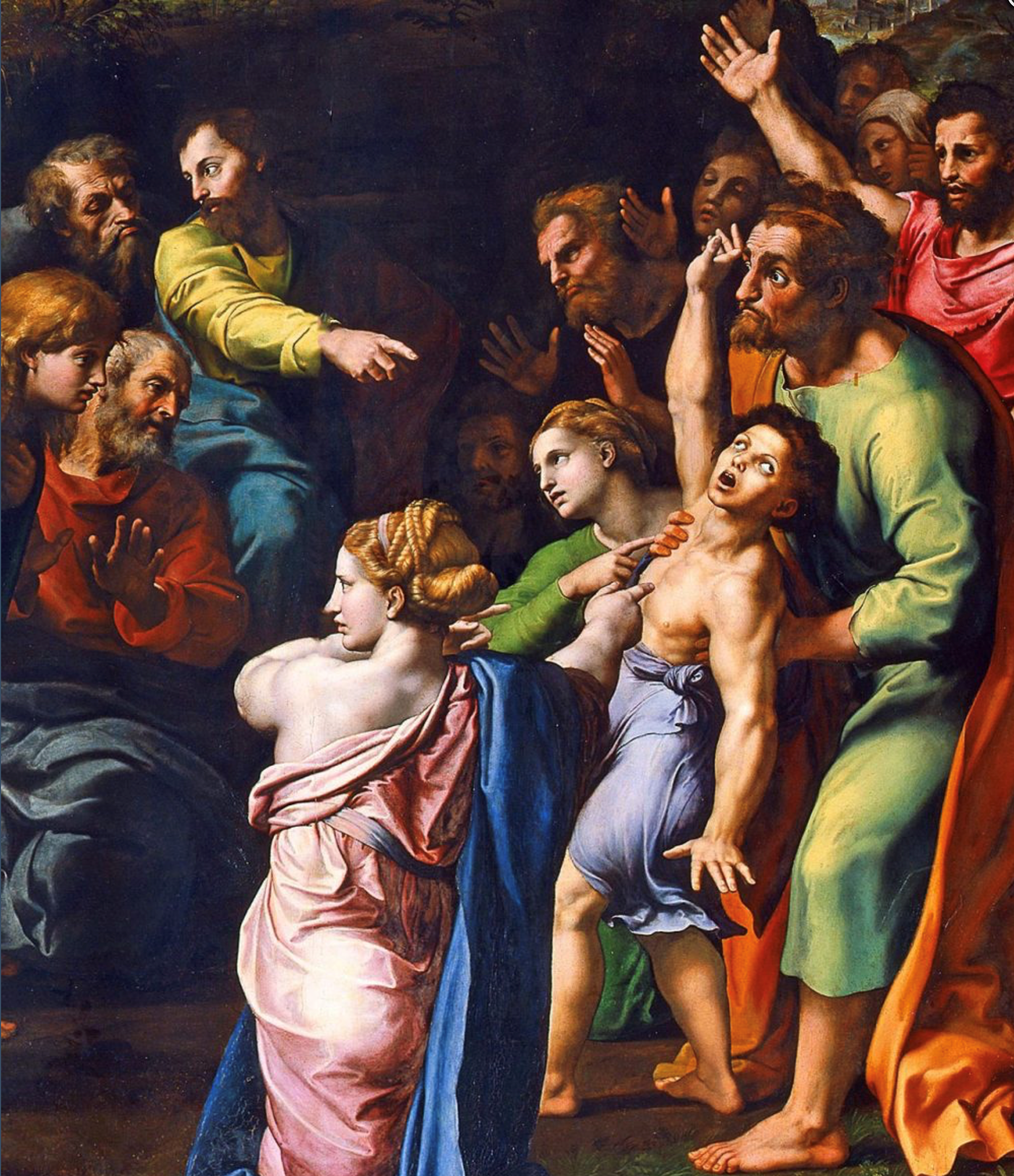 Ci-contre: tableau La Transfiguration de Raphaël, détail sur le fils épileptique.